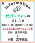 2025年10月3日 / 最終更新日 : 2025年10月3日 小野田美穂 フィットネススクールレッスン代行のお知らせ 10月10日(金曜日) のフィットネススクール「コンディショニング+リンパヨガ」は講師の都合により代行でのレッスンとさせていただきます。 変更に伴い、ご迷惑をおかけいたしますがよろしくお願いいたします。 ※ 和所 亜希子 […]