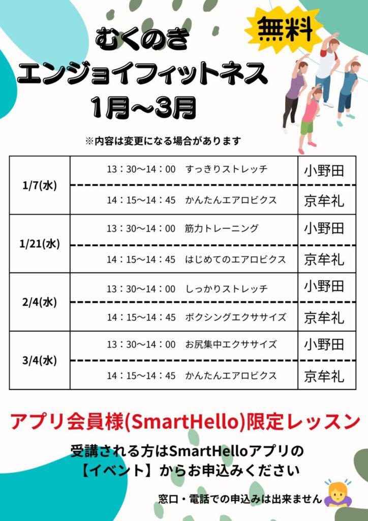 | 開催日時 | ●1月7日(水) 13:30~14:00 すっきりストレッチ 14:15~14:45 かんたんエアロビクス ●1月21日(水) 13:30~14:00 筋力トレーニング 14:15~14:45 はじめてのエアロビクス ●2月4日(水) 13:30~14:00 しっかりストレッチ 14:15~14:45 ボクシングエクササイズ ●3月4日(水) 13:30~14:00 お尻集中エクササイズ 14:15~14:45 かんたんエアロビクス |
