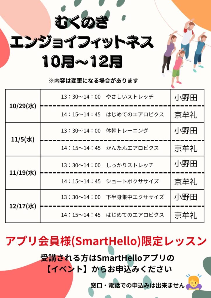 開催日時 | ●10月29日(水) 13:30~14:00 やさしいストレッチ 14:15~14:45 はじめてのエアロビクス ●11月5日(水) 13:30~14:00 体幹トレーニング 14:15~14:45 かんたんエアロビクス ●11月19日(水) 13:30~14:00 しっかりストレッチ 14:15~14:45 ボクシングエクササイズ ●12月17日(水) 13:30~14:00 下半身集中エクササイズ 14:15~14:45 はじめてのエアロビクス |