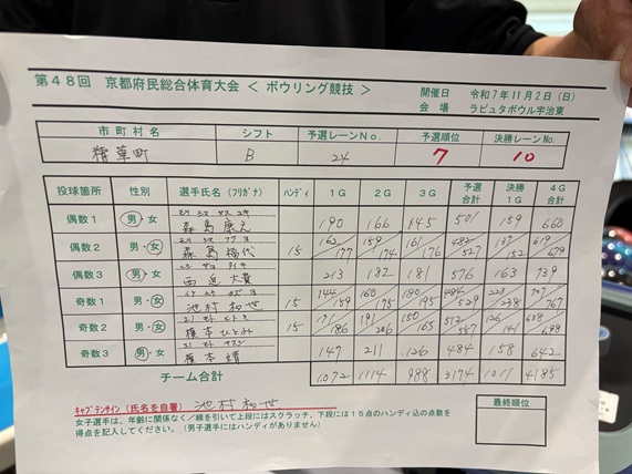 11月2日(日)、ラピュタボウル宇治東(宇治市)においてボウリング競技が開催され、精華町から6名が出場しました。