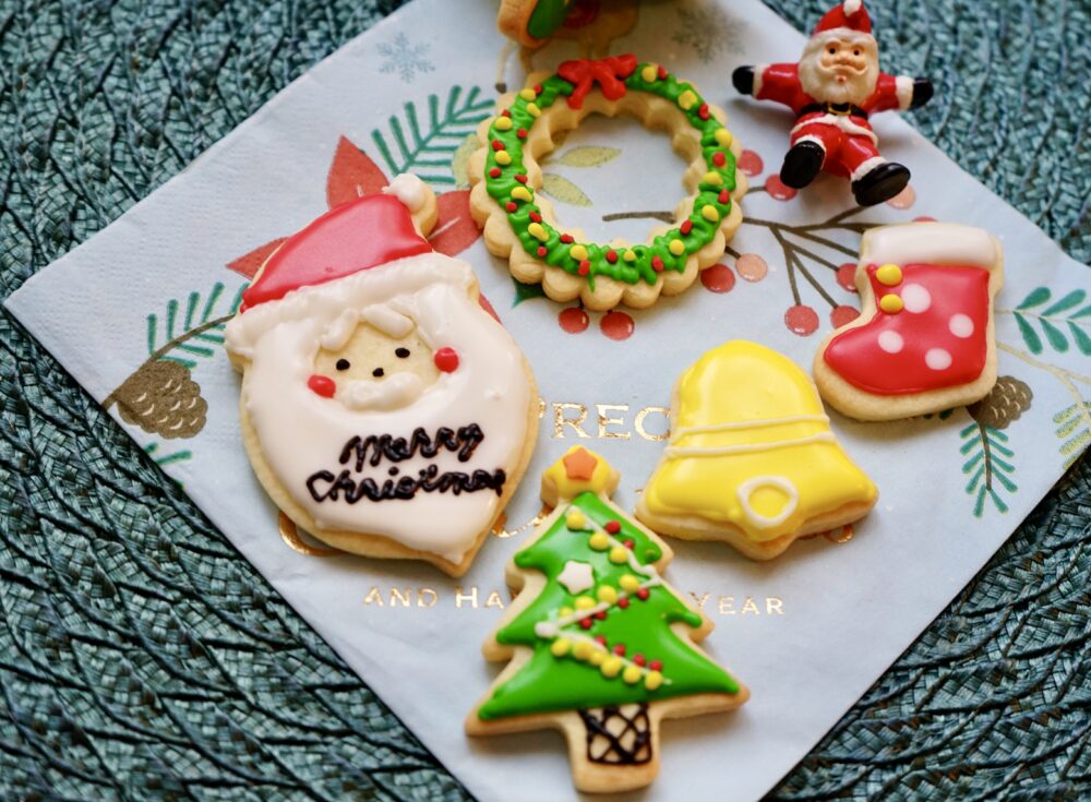 あらかじめ焼いたクッキーにツリーやサンタクロースなどアイシングで絵を描き、クリスマス風クッキーを5枚を作ります。